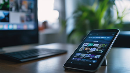 A sleek smartphone displays colorful applications against a blurred background of a computer, creating a modern and inspiring workspace atmosphere.