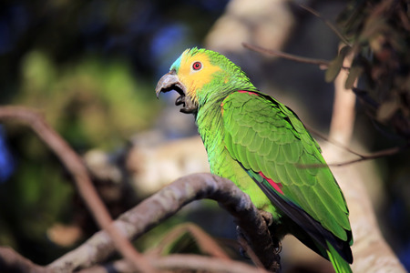 Red lored parrot (Amazona autumnalis) on the branch. Slightly motion blurred image, due to birds movement