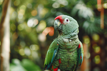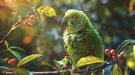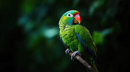 Vibrant parrot with green feathers and red accents perched in a lush jungle setting, full of tropical charm. Generative AI