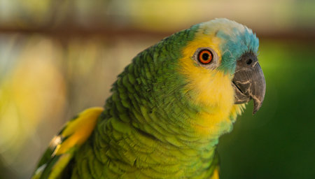 Detailed close-up of a tropical parrot showing vivid green and yellow feathers and a bright red eye. The image captures the intelligence and charm of this talkative South American bird.