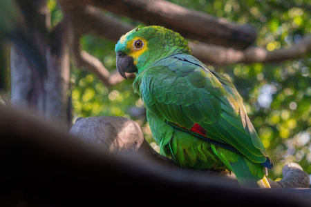 Green parrot sits on a branch, Brazil Foz do Iguazu. With selective focus
