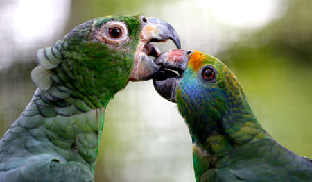 Two vividly colored green parrots are featured, perched closely on a tree branch. Their feathers showcase detailed texture and a gradient of green hues, accented with red and yellow markings. The composition utilizes natural lighting, suggesting an outdoor environment. This image is suitable for various commercial uses, including editorial and design projects.