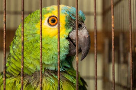 Parrot bird caged green orange feathers exotic pet close-up Trinidad and Tobago