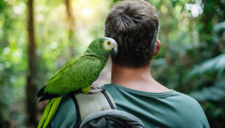 A lively green parrot rests on the shoulder of a person in a dense, vibrant forest.