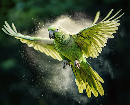 A vibrant parrot soars gracefully through the air, wings outstretched, with colorful plumage contrasting against a dark background filled with luminous dust particles.