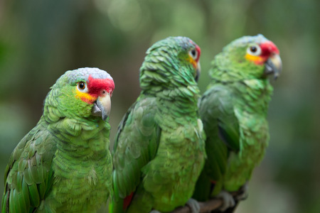 Mexican Red-headed tropical parrot on a brunch, zoo. birds. Colorful exotic birds.