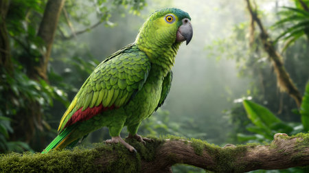 An Amazon parrot Amazona species perched on a mossy branch in a vibrant rainforest surrounded by dense green foliage, showcasing its colorful plumage, curved beak, and natural habitat.