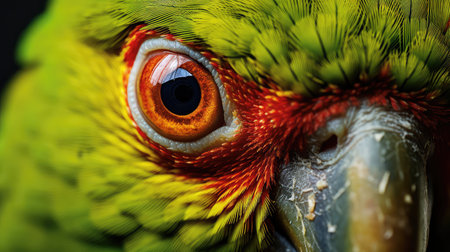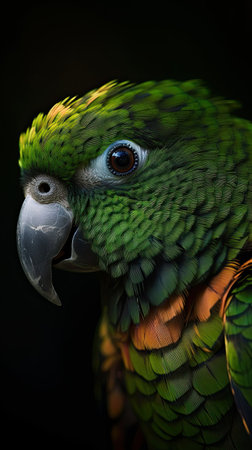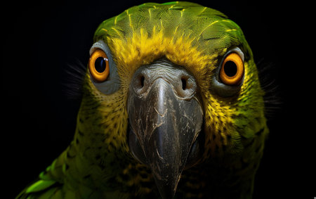 A captivating portrait ideal for wildlife publications, educational materials on birds, or for any avian enthusiast | This striking image showcases the powerful gaze of a parrot, with its piercing orange eyes staring directly at the viewer, creating an immediate connection. The fine detail in the feathers around the eyes evokes the bird's wild and natural habitat, highlighting the textural contrast and vibrant yellow and green hues against the dark background. The bird's beak, with its worn and textured surfaces, tells a story of survival and adaptation. The sharp focus on the facial features of the parrot draws attention to the intricate patterns and colors of its plumage, conveying the beauty and diversity of avian life. The use of a black backdrop isolates the subject, emphasizing its striking features and allowing for a dramatic interplay of light and shadow that gives the photograph a three-dimensional feel | This image is perfectly suited for use in documentaries and presentations about tropical wildlife, as a teaching aid in ornithology, or as a standout piece in a collection of nature photography. It could also serve as a bold graphic in pet care and conservation campaigns, or as an exotic touch to interior decor themes centered on natural beauty and wildlife | a close-up photo of a parrot's face with a sharp emphasis on its eyes, beak, and feather textures, set against a pure black background to highlight the subject, suitable for textual or graphical content