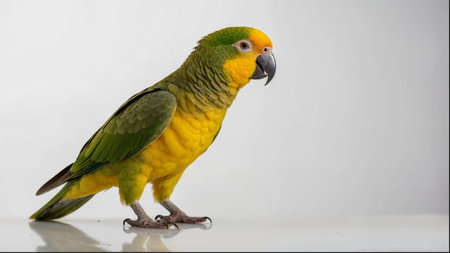A yellow and green parrot is standing on a white surface. The bird is looking at the camera