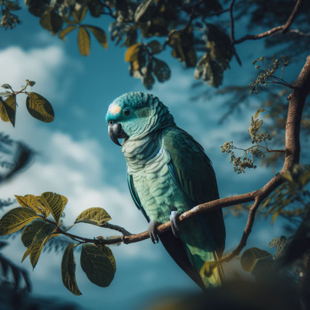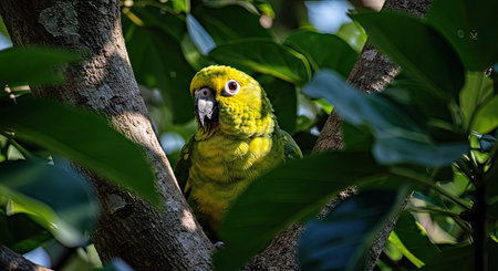 Close up of a mealy amazon parrot showing its vibrant green plumage while perched amidst dense foliage