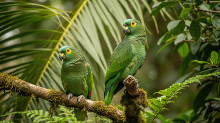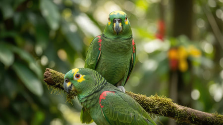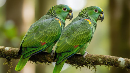 Two bright green parrots are positioned on a branch, displaying their plumage. The scene presents a vivid color palette within a dense forest setting. The detailed composition, including natural lighting, lends itself to various commercial and editorial applications. The image showcases the beauty of wildlife.