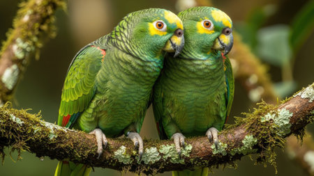 Two vibrantly colored green parrots are perched closely together on a textured branch, showcasing bright yellow head markings. The birds are set against a blurred background of green foliage. The composition and color palette lend themselves well to nature, wildlife, or environmental-themed projects and offer versatile use.