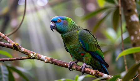 Exotic Birds of Costa Rica. The Colorful Red-Lored Amazon Parrot in a Tropical Rainforest
