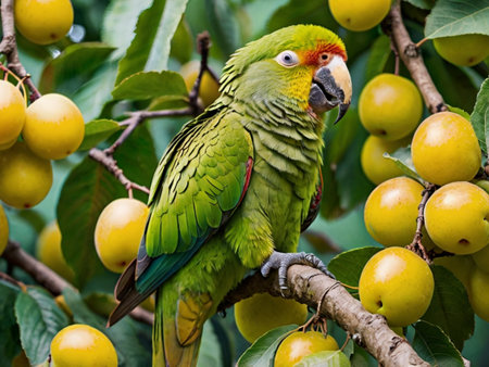 Orange Winged Amazon Parrot (Amazona amazonica) feeding on fruit in a mango tree. Tropical bird in tree. Bird in a garden.