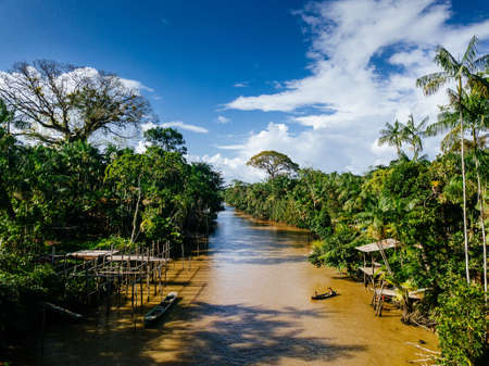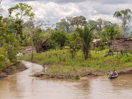 Amazon River, Peru - May 13, 2016: Small village on the bank of the Amazon River. Amazon. South America.