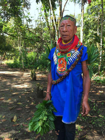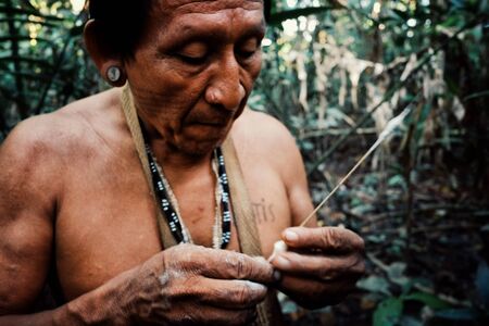 Nueva Loja, Sucumbios / Ecuador - September 2 2020: Elderly indigenous shaman of Cofan nationality walking head-on through the jungle in the Amazon