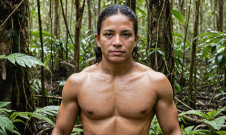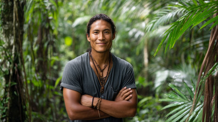 A striking portrait captures an indigenous man in traditional attire, standing proudly amidst lush greenery, showcasing his rich cultural heritage and connection to nature.