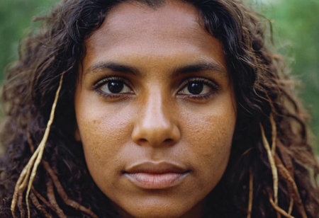 This striking portrait captures a proud Aboriginal Australian woman, showcasing her cultural heritage through intricate jewelry and a beautiful flower crown.