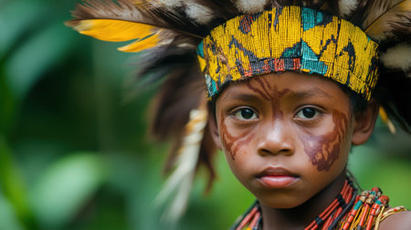 Portrait of a Young Child with Tribal Face Paint and a Decorative Feathered Headpiece. High quality photo