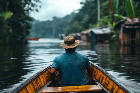 Indigenous Ecuadorian fisherman rowing a canoe on the Amazon river, wearing a straw hat, navigating through the rainforest
