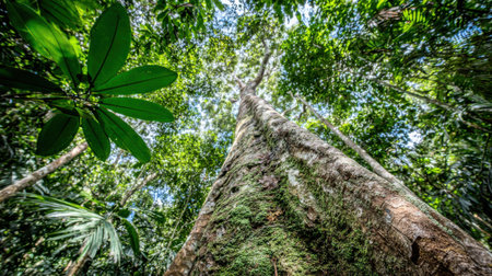 Majestic tall tree trunk rises high surrounded by dense green foliage and broad leaves in vibrant rainforest viewed from low angle emphasizing natural grandeur
