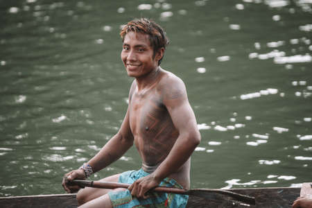 Indigenous caboclo man from an Amazon tribe in Brazil with tribal art painted on his body, riding canoe. Xingu River, Jogos IndÃgenas 2010.