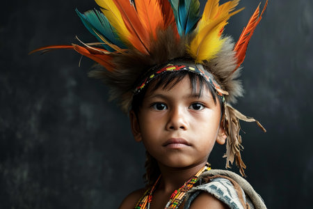 Portrait of a young boy in colorful indigenous attire against a dark background