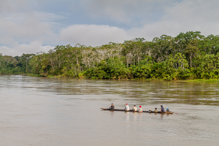 PANTOJA, PERU - JULY 9, 2015: Villagers on a dugout canoe called Peke Peke on a river Napo, Peru