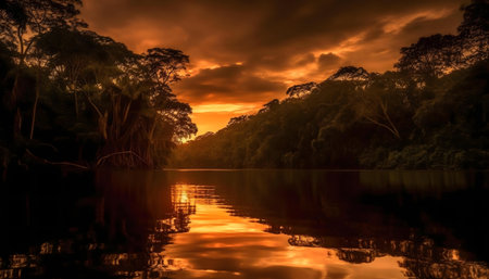 Stunning sunset paints the sky and river in fiery hues, reflected in tranquil rainforest waters.
