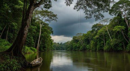 Kayak travel in tropical jungle rainforest. Nature exploration. Generative AI