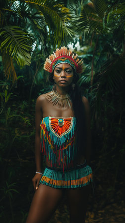 A woman stands confidently in a vibrant jungle, dressed in colorful tribal attire designed for adventure. Surrounding her are lush green plants and towering trees, highlighting the wild atmosphere.