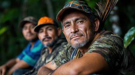 Group of indigenous Amazon men posing in the rainforest with traditional tools, representing community, culture and connection to nature.
