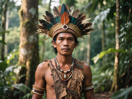 A proud indigenous warrior adorned with a vibrant feather headdress and body paint stands amidst the dense greenery of a tropical rainforest.