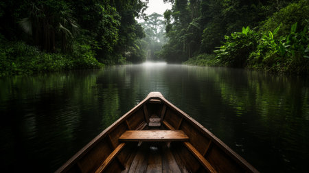 A small wooden boat floats silently on a calm river, surrounded by lush greenery. Mist hangs in the air, creating an ethereal atmosphere as dawn breaks over the peaceful waters.
