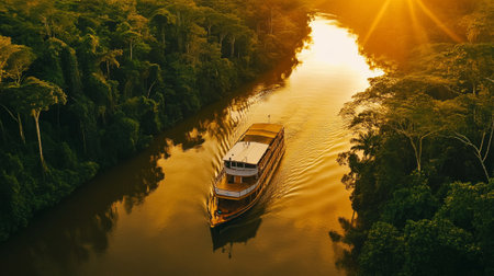 Aerial view of tourist boat on the river in the jungle.