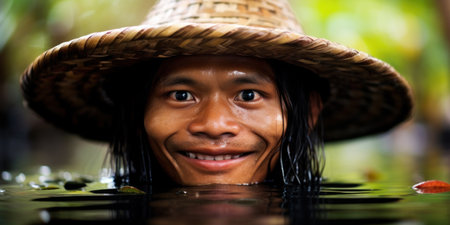 An AI generated illustration of a portrait of an indigenous man sitting in a river near several traditional canoes