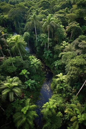 Aerial view of the amazon rainforest, with its dense canopy and diverse wildlife, captured