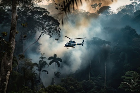 helicopter flies through the jungle, with hot smoke billowing from its engine, created with generative ai