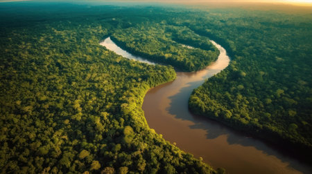 Aerial view of a meandering river through a dense rainforest. Lush green canopy and stunning natural beauty.