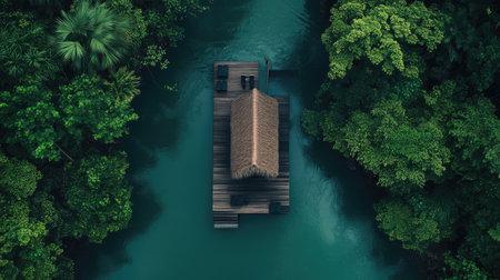 A stunning aerial view of a floating cabin nestled in the heart of a tropical rainforest. Surrounded by lush greenery and calm waters, this image captures the essence of tranquility and natural beauty, inviting viewers to imagine a perfect retreat in nature.