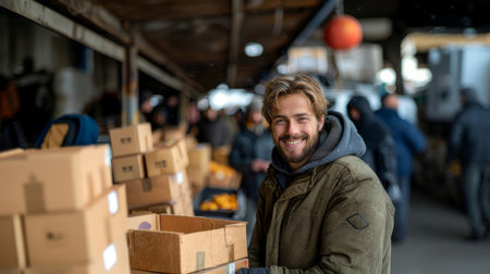 A joyful male volunteer stands in a busy donation center, surrounded by cardboard boxes filled with food, smiling at the camera.