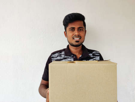 Smiling south Indian man holding cartboard box in his hands. Copy space. White background. Parcel Concept