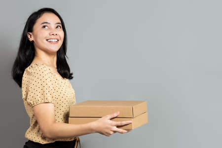 Beautiful indonesian woman posing holding a pizza box