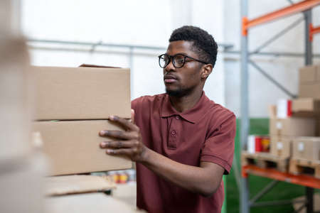 Young male worker of warehouse making stack of boxes with goods