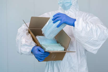Doctor in PPE and medical mask opens a box and show the packing of a new surgical masks, which he must take during an pandemic of covid-19. This face masks will help to prevent coronavirus