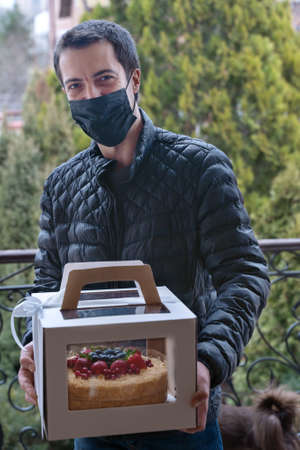 Young smiling man stands in front of the door holding cardboard box with holiday cake decorated with berries. Spring time, mask on the face, courier or family member bringing the dessert.