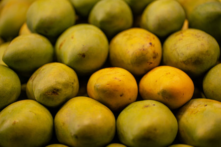 Close-up on a bowl of ambarellas (jew plums) for sale on a market stall.
