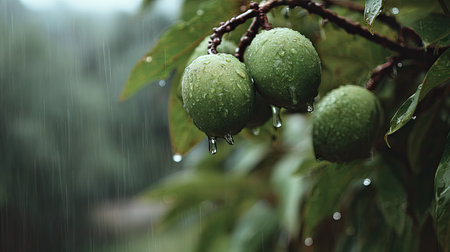 Soft rain falling gently on White sapote, with water droplets forming and slowly dripping. The background is softly blurred with a natural, moody atmosphere.