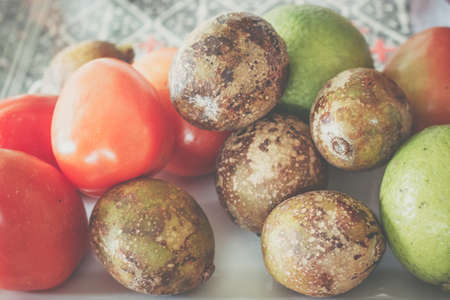 Old,green and yellow,local Indonesian fruit namesKedondong,placed on the brown wooden background