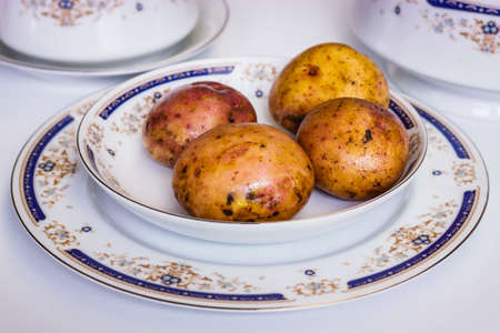 Four potatos in a white plate